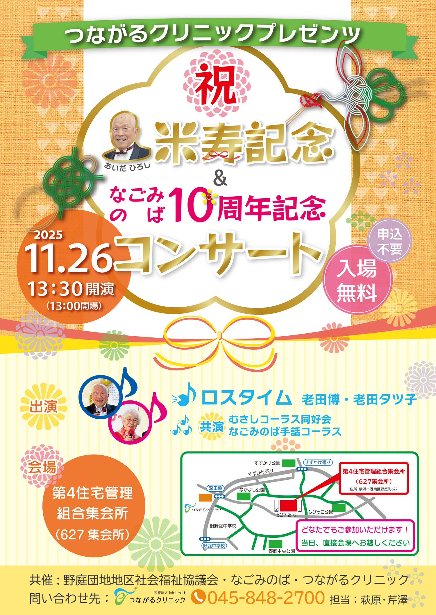 野庭団地地区社会福祉協議会・なごみのば・つながるクリニックの共催で、老田博さんの米寿記念コンサートを開催します!