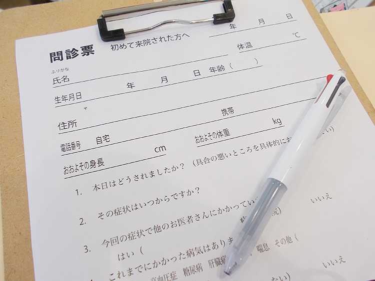 受付にて問診表をお渡し致しますので、必要事項をご記入下さい。また、特別具合が悪い方(高熱やインフルエンザの疑いなど)はご遠慮なくお申し出下さい。